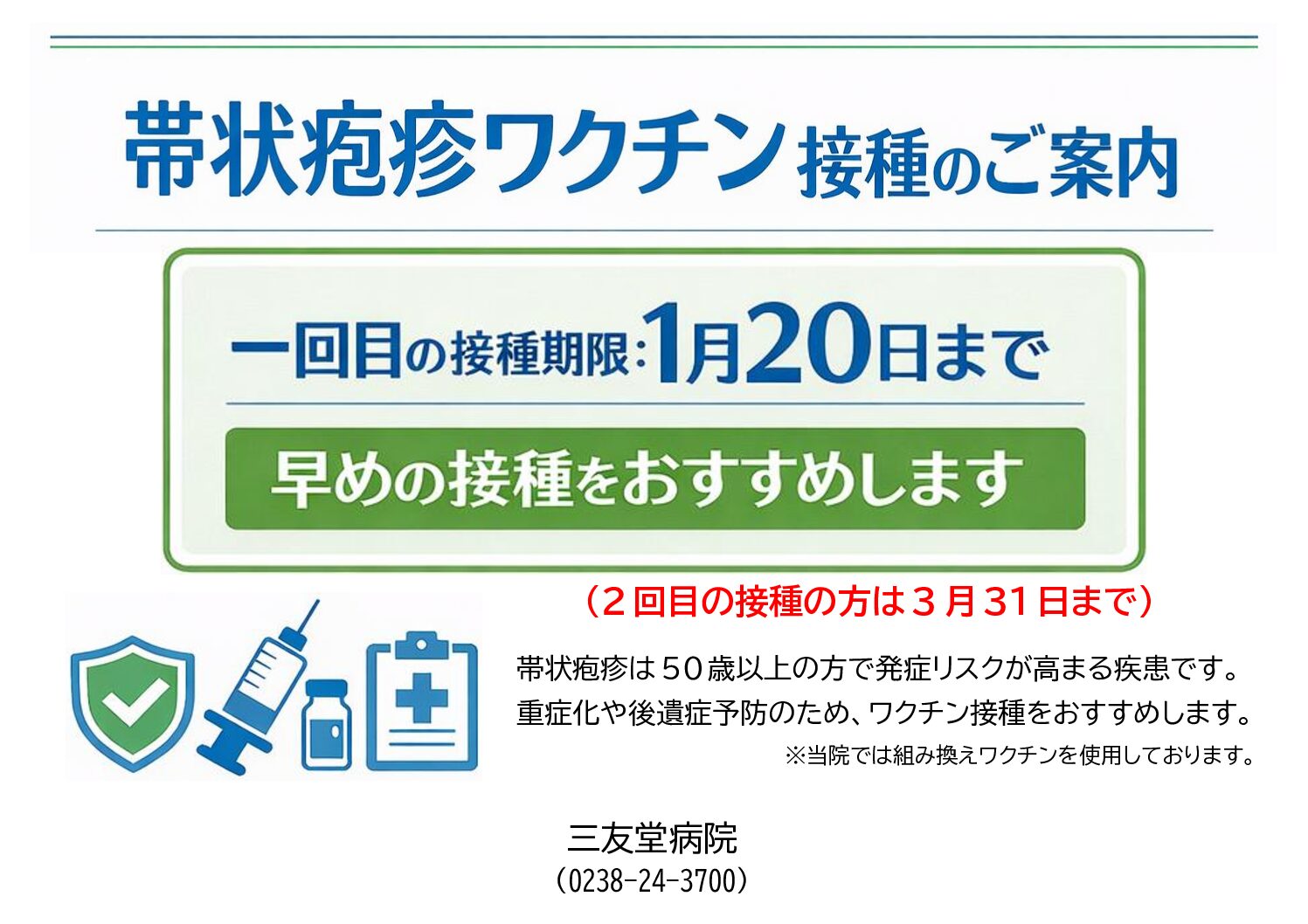 2025年12月25日 / 最終更新日時 : 2026年1月5日 P3QYd7vSOC お知らせ 帯状疱疹ワクチン接種のご案内 早めの接種をおすすめします。 (※当院では組み換えワクチンを使用しております)